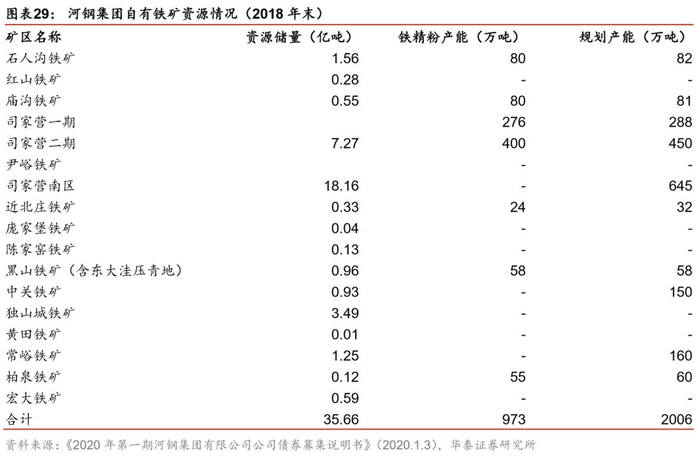 河钢集团旗下铁矿资产丰富。根据河钢集团债券募集说明书(2020.1.3),截至2018年末,河钢集团境内自有铁矿资源储量35.66亿吨,现有产能为973万吨,规划产能2006万吨。其中,司家营矿区是我国三大铁矿区之一,区内矿石以磁铁矿为主,矿产成分较为简单,一期、二期主要以露天开采为主,目前仍处于正常开采状态;三期为地下开采,目前正在建设当中。