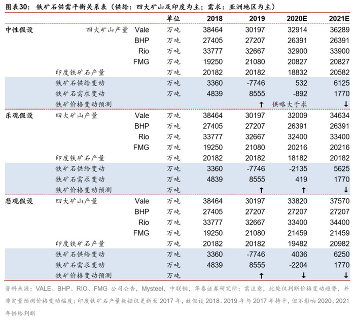 供给方面,2018-2021年四大矿山资本支出项目多以维护、替代矿区为主,Vale复产进度仍需当地矿业局、检察院等监管、审查,存在变数;需求方面,2020年中国地产投资增速或下行,叠加中国、韩国、日本等受新冠疫情影响,铁矿需求或萎靡。中性假设下,我们判断2020年铁矿供略大于求,但港口库存低位,2020年铁矿价格或同比持平。