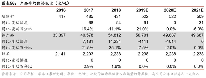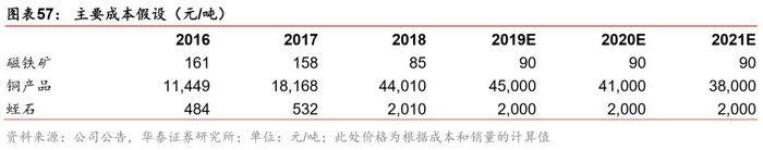 铁矿石方面,如前所述,中性假设下预计2020年价格同比或持平,2021年同比或下行,假设2019年公司磁铁矿销售价格同比变动幅度与市价一致,2020、2021年分别同比变动0%、-6.0%。铜产品方面,考虑到虽然2020年整体或供过于求,但供给端存在扰动因素,故假设铜价小幅下行,2021年供需关系或相对平稳,假设铜价同比持平。蛭石方面,预计未来价格走势相对平稳,假设2019-2021年公司蛭石售价与2018年持平。