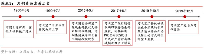 公司是河钢集团旗下矿产资源平台。河钢资源股份有限公司曾用名为河北宣化工程机械股份有限公司(以下简称 “河北宣工”、“公司”),前身为宣化工程机械厂,始建于1950年,1999年于深交所上市。2015年,河北省国资委同意将公司控股股东河北宣工机械发展有限公司(简称“宣工发展”)全部股权无偿划转至河钢集团有限公司(以下简称“河钢集团”),河钢集团成为公司的控股股东。