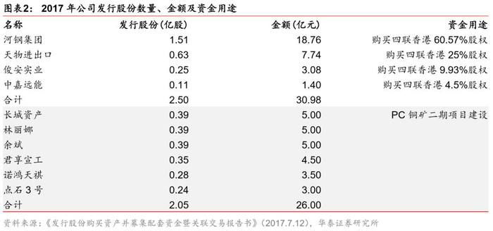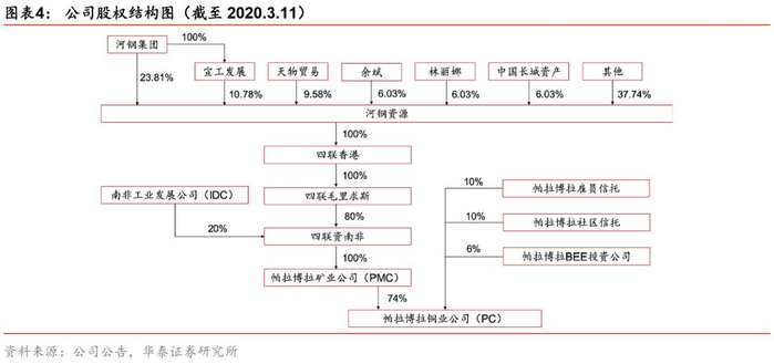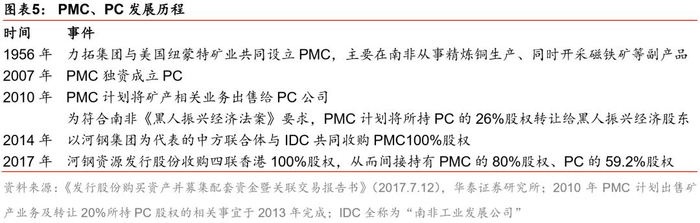 公司是河钢集团旗下矿产资源平台,目前河钢集团自有铁矿现有产能973万吨,规划产能2006万吨。根据公司2018年报,为避免同业竞争,相关铁矿资源已由公司托管,未来达到条件后,存在注入公司体系的可能。另外,PC公司所在林波波省矿产资源丰富,且根据交易报告书(2017.7.12),PC公司未来计划通过外购铜精矿、并购公司等方式实现资源扩张。