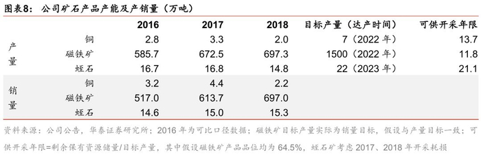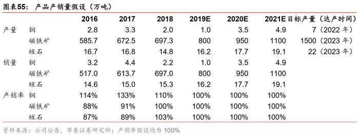根据《投资者关系活动记录表》(2019.3.25),目前公司磁铁矿产能约1000万吨,其中新开采部分约为150-200万吨,堆存部分占主要地位;2018年公司实际产量仅约700万吨,主要因当年南非降雨偏多,影响水采系统正常运行。根据公司2018年报,公司计划2020年开始持续提高磁铁矿发运能力,逐步达到1500万吨/年的销售目标;考虑到公司预计铜二期项目于2022年达产,磁铁矿新开采部分产能有望提升,因此公司或最早将于2022年及以后具备1500万吨磁铁矿产销能力的可能性。
