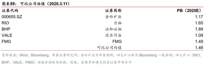 以2020年3月11日收盘价计,金岭矿业PB(2020E)为1.17倍,四大矿山(RIO、BHP、VALE、FMG)PB(2020E)分别为1.65、1.89、1.09、1.49倍,因此可比公司PB(2020E)均值为1.46倍。目前公司PB(LF)为1.27倍,考虑到公司产品规模和成本不及四大矿山,给予公司1.35-1.45倍PB(2020E)估值,取公司BPS(2020E)为10.95元,对应目标价14.79-15.88元。