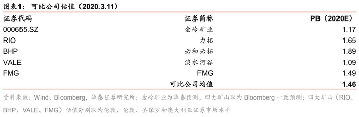 考虑到资产状况、经营能力,A股上市公司中选取金岭矿业作为可比公司;另外,由于公司矿区位于海外,且同时经营多种矿产资源,因此选取经营模式较为类似的四大矿山(RIO、BHP、VALE、FMG)作为可比公司。以2020年3月11日收盘价计,金岭矿业PB(2020E)为1.17倍,四大矿山(RIO、BHP、VALE、FMG)PB(2020E)分别为1.65、1.89、1.09、1.49倍,因此可比公司PB(2020E)均值为1.46倍。目前公司PB(LF)为1.27倍,考虑公司规模和成本不及四大矿山,因此给予公司1.35-1.45倍PB(2020E)估值,取公司BPS(2020E)为10.95元,对应目标价14.79-15.88元。