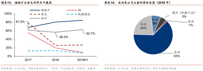 磁铁矿贡献主要营收和毛利。2017年公司进行资产重组后,主营业务从机械制造转向以磁铁矿、铜为主的矿产业务。另外,铜一期项目临近枯竭,开采难度大、品位下降,导致2018年公司铜产品毛利下滑较多,磁铁矿的毛利占比逐步提高,2019H1达到90%以上。