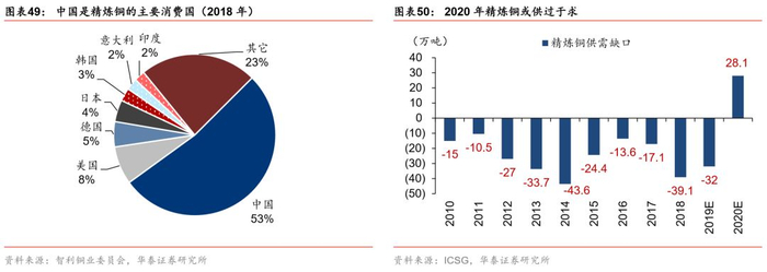 2020年全球精炼铜或供过于求。根据国际铜业研究小组(ICSG)最新的研究报告(2019.10),预计2020年精炼铜将面临供过于求的局面,预计供给过剩28.1万吨。