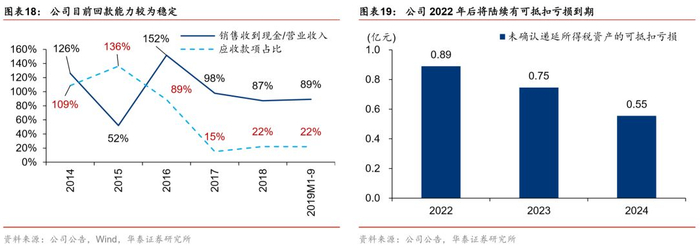 目前公司回款能力较为稳定。2018年和2019年前三季度,公司销售收到现金占营收比例、应收款项占比均较为稳定,分别约为90%、22%。