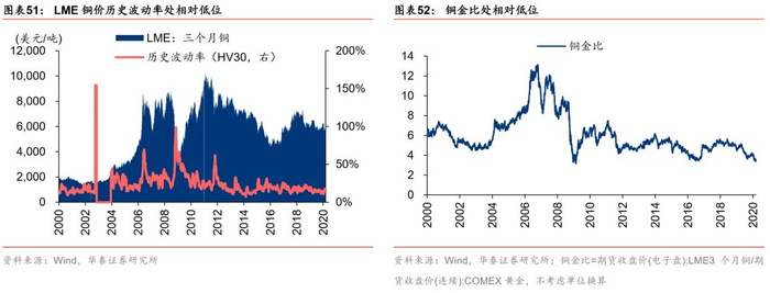 铜矿开采若扰动,铜价或上涨。根据华泰有色团队报告《量化解读铜市:悲观造就低谷,低谷孕育反弹》(2019.12.02)的观点,目前铜价历史波动率和铜金比均处于历史低位:2020年3月11日,LME铜价历史波动率(HV30)为14.5%,自2000年初至今的历史分位为21.8%;铜金比为3.36,自2000年初至今的历史分位为0.20%。当前波动率和铜金比均已处于历史较低水平,表明目前铜价走势偏弱、且市场对未来经济预期或过于悲观,若铜矿供给出现短期扰动,铜价具备较好的上涨基础。