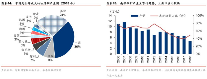 南非铜资源禀赋较差,铜矿产量为5.2万吨(2019年),全球占比约为0.26%;冶炼铜产量为3.3万吨(2018年),全球占比约为0.19%;且目前南非铜矿产量水平以及表观消费占产量比例均呈现下行趋势,2018年表观消费占产量比例仅为48.9%。