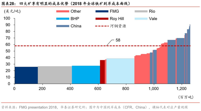 公司铁矿石到岸成本相对国内部分矿山具备一定优势。全球视角看,主流矿主要以四大矿山为主,具备成本低、质量优的相对优势,公司属于非主流矿,一般成本相对较高。以中国到岸成本粗略测算看,四大矿山具备明显优势,公司2018年到岸成本(“营业成本+运输费”口径)约为58美元/吨,相对四大矿山不具备明显优势,但相对国内部分矿区具备一定成本优势。