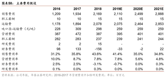销售费用方面,公司拆分为职工薪酬、运输费等数项。其中,目前公司对PC公司管理已基本成熟,未来职工薪酬增长或相对平稳,假设2019-2021年增速均为1%;由于公司磁铁矿主要对国内销售,因此占据运输费的主要部分,故按照磁铁矿销量计算吨口径运输费,虽然销售渠道存在优化可能,但保守假设仍维持现有水平。管理费用方面,主要为职工薪酬,假设2019-2021年增速均为1%;其余项按照近3年加权平均进行假设。研发费用方面,2016-2018年均投向机械制造业务方面,因公司现已将相关业务置出,故假设2019-2021年研发费用为0。财务费用方面,根据公司现金、借款、债券等数据预测公司利息费用、收入。