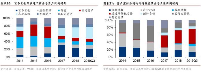递延所得税负债占比较高。2019Q3末,公司总负债、流动负债分别为40.3、17.6亿元,其中递延所得税负债16.2亿元,该债务主要在2014年中方联合体收购PC时形成。一是因为2014年收购PC时,前期对于堆存磁铁矿部分的资产评估价值与实际收购时存在差异,二是因为南非税法规定矿山资本支出可税前抵扣。