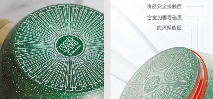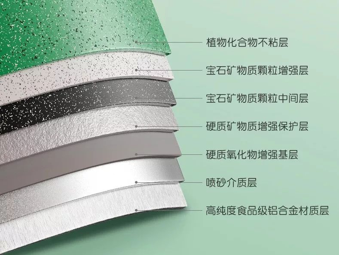 而最外层就是为锅具“染色”的「植物化合物不粘层」,萃取自植物精华,健康安全。