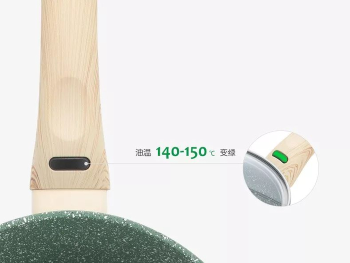 这款锅还可以智能控温,当油温到140℃~150℃时,手柄处的感温器就会变成绿色。