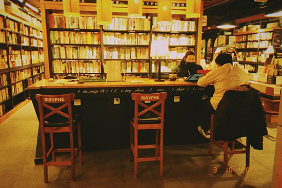再上到三层,西西弗书店格外安静,不过,店内的背景音乐提醒这里仍在营业。书架深处,有人在阅读区工作,6人的书桌已有5个座位上有书。
