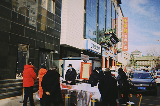 吴裕泰王府井店特殊营业,两位店员在门口休息