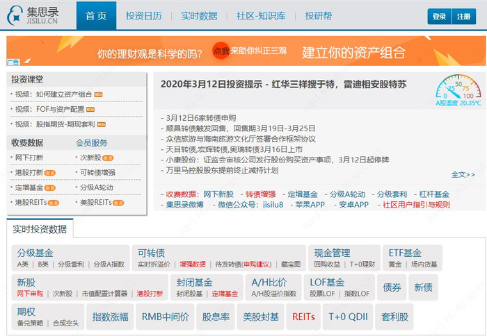 集思录最逆天的功能就是其数据功能,共包含:可转债、债券、分级基金、A股/港股打新、指数ETF、封基(比如兴全合宜)、REITS、股息率、各种套利等各个板块。