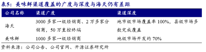 区域性明显,空白市场有待扩张。美味鲜目前仍是半全国化布局,体现在:一是区域结构不平衡,估算一二级市场(东南五省)营收占比约75%,其他市场不够成熟。二是地级市场覆盖不足,全国300多个地级市场,目前还有80多家未覆盖,而海天已完成全国布局,地级市几乎全部覆盖,县级市场多数已覆盖。三是经销商数量低于海天,估算2019年底美味鲜经销商数量约1000家,对比海天3000家经销商,仍有发展空间。