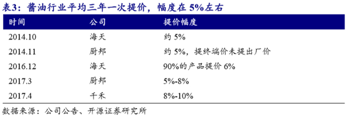 价升主要源于:一方面行业定期直接提价。周期大概三年一次,提价幅度每次约5%,促发因素通常是成本上涨或渠道利润变薄。另一方面消费习惯转变,消费者对美味追求带来产品结构提升。表现为一是品类之间替代升级,如鲜味酱油替代味精;二是品类内部结构升级,如特级、一级酱油替代二级、三级酱油等。