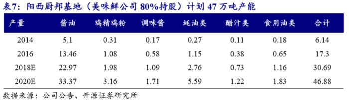 阳西厨邦基地(美味鲜公司80%持股):阳西厨邦基地2012 年筹建,计划47万吨产能,其中规划酱油产能33万吨。目前已释放酱油产能约20万吨,以及4-5万吨小调味品。预计2021年可满产运行。