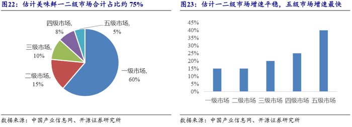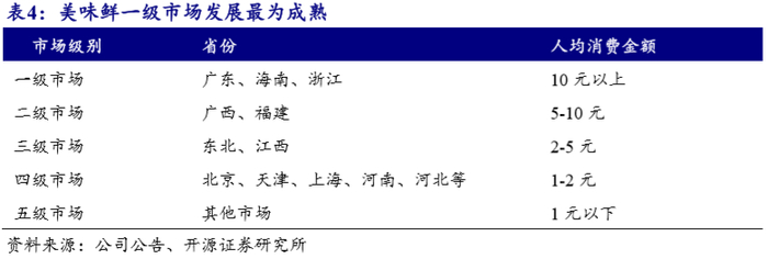 阵地式发展,按层级推进。公司依照各区域人均消费金额,将全国划分为五级市场。各级市场策略不同,按层级分别推进。如一二级市场开发程度较好,相应增速较为稳定,未来将以开拓餐饮渠道以及品类扩张为主;三四级市场增量来自于渠道精耕下沉带来的持续增长;五级市场基数较小,增速应是最快,未来增长更多在于新增空白市场覆盖。