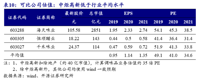 市场对于食品饮料行业通常采用相对估值方法。我们对比调味品主要企业估值水平,可发现2020年调味品行业平均估值在41倍PE左右,而中炬高新扣除地产,调味品业务目前估值约35倍PE,低于行业平均水平。