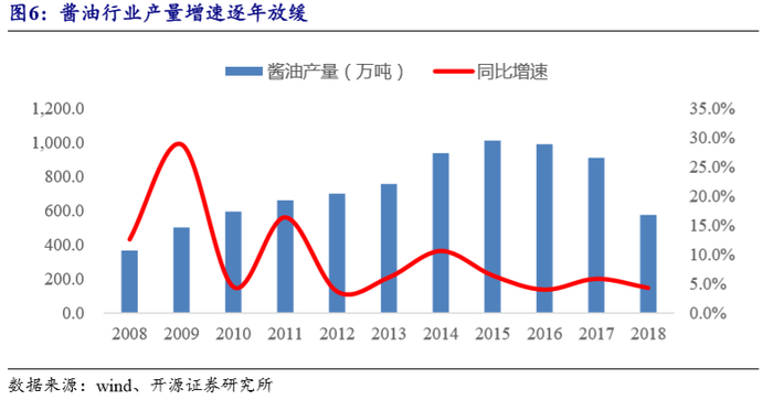 统计局公布2017年酱油行业产量910万吨;2018年酱油行业产量575万吨,同比增4.3%。该口径差异原因是2018年统计局对规模以上企业口径有所调整,增速更具有代表意义。产业人士多沿用910万吨口径,我们通常所说的海天销量市占率20%,是指以910万吨为行业总量口径来计算。观测酱油行业产量增速,呈逐年放缓趋势。
