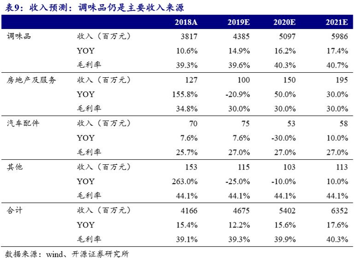 我们认为调味品业务2020年营业收入将有16%左右增长。分区域看,核心地区渠道下沉,估计可以保持10%-15%左右增长。非核心地区定点突破,收入增速预计可能在15%-20%区间。暂不考虑地产收入及母公司处置资产情况,我们预计2019-2021年公司合并报告营收分别增长12.2%、15.6%、17.6%。
