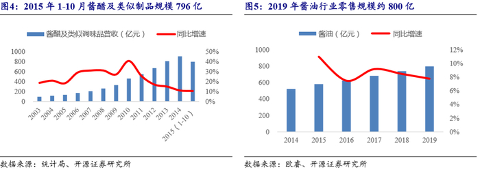 口径说明:酱油行业口径较多,需要区别每个口径含义。根据统计局数据(截至2015年10月),酱醋及类似制品行业规模796亿,同比增10.5%。根据欧睿数据,2019年酱油零售规模800亿,同比增7.8%。我们综合测算分析,2019年酱油行业产值规模应该在400亿左右水平。