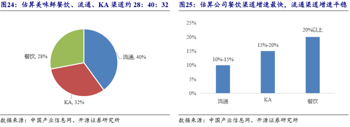 阵地式发展,按层级推进。公司依照各区域人均消费金额,将全国划分为五级市场。各级市场策略不同,按层级分别推进。如一二级市场开发程度较好,相应增速较为稳定,未来将以开拓餐饮渠道以及品类扩张为主;三四级市场增量来自于渠道精耕下沉带来的持续增长;五级市场基数较小,增速应是最快,未来增长更多在于新增空白市场覆盖。3.3.2、渠道:拓展餐饮,全渠道运营