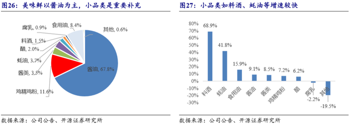 自下而上开拓餐饮终端,寻求厨师意见领袖。海天餐饮渠道是通过厂家对接餐饮经销商,依靠经销商维护餐饮店的客情关系,自上而下进行管理。美味鲜由于发力较晚,采取自下而上方式:由公司进行餐饮终端建设与维护工作,拉动终端需求。核心思路是抓住厨师意见领袖,通过组织厨师俱乐部、厨师比赛等形式,利用名厨影响力来进行营销。同时产品端也计划开发大包装产品与产品结构档次略低的二梯队产品,进一步扩大餐饮覆盖面。预计餐饮渠道占比未来可能会稳定在40%左右。3.3.3、品类:以酱油为主,多品类协同发展