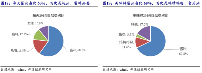 美味鲜调味品结构中,酱油占比68%(2019H1数据),是公司核心产品,也是渠道拓展、市场扩张的主力品类。其次为鸡精鸡粉(占比12%)与食用油(占比8%)。而小品类(蚝油、黄豆酱、醋、料酒)等是重要补充。目前已形成酱油支柱产品与潜力小品类共同发展的品类结构。