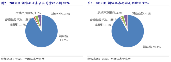 调味品贡献主要收入利润。2019H1公司调味品业务占收入比例约91.6%,占毛利比例约92.1%,是主要收入与利润来源。2019H1调味品业务中,酱油占比68%,贡献最高,是公司经营主要品类。