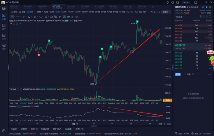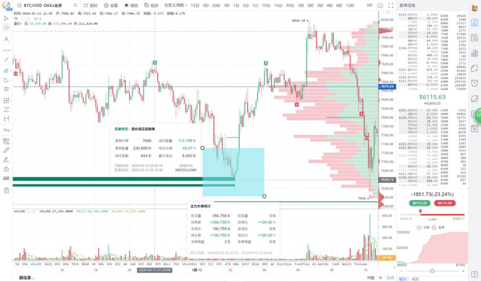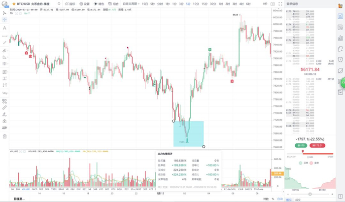 AICoin PRO版K线主力大单跟踪显示:3月12日凌晨两点前后,在7600-7700区间的大量托单的诱导下,比特币最低跌至7635美元,火币以及OKEx的BTC季度合约在这个位置总成交7笔,总金额超过4000万美元的买入开多单。主力开多后,价格迅速反弹,到早上七点前后一度涨至8000美元以上。