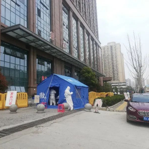 现在想进入武汉市中心医院发热门诊不容易了。自2月下旬,急诊一侧的空地,前后立起两个简易帐篷,一红一蓝,把守着进入发热门诊的必经通道。
