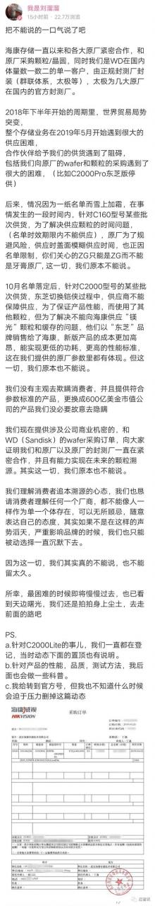 对此问题,随后疑似是海康威视内部人士的B站用户@我是刘溜溜 发文解释称,2019年5月开始,一些原厂向海康存储供货遇到了阻碍,比如C2000 Pro东芝版停供。后来又因为传闻可能被美列入清单,在此后的一段时间内,针对C160型号的某些批次供货,为了解决供应颗粒的时间问题(名单时效期限内不能供应),原厂为了规避风险,供应时盖面模糊供应时间。另外之前外界质疑的C2000 Pro紫光版的存储颗粒来源,海康威视也一直闭口不谈也是有着某方面的原因。所有,即便是遭到了UP视频连线直播时逼问,也无法明说。