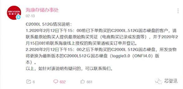 2月13日,@海康存储办事处 在B站发布了针对C2000L 512G情况说明,称2020年2月12日下午15:00前下单购买C2000L 512G固态盘,并能提供原始购买凭证的客户,可以联系海康威视授权的购买渠道核实订单并登记。但是该说明仅发布在了B站,也并未说明具体原因和明确“一赔三”的承诺。这人很多不明白事情来龙去脉的人摸不着头脑。