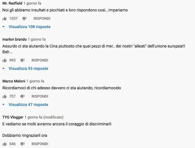 在脸书、推特等社交网络上,意大利一些无知的年轻人,发表“中国人吃狗肉,吃老鼠,现在吃蝙蝠!恶心”等等言论。尽管下拉评论里有些理性声音在解释:“还有人吃生鱼,吃生牡蛎,吃脑……每个国家都有自己的文化”,但很快会被一些歧视和谩骂华人的话语淹没。