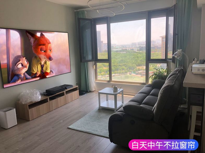 晚上关了灯,画质更好了,一家人悠哉悠哉的在客厅追个剧、看个电影都很有氛围~