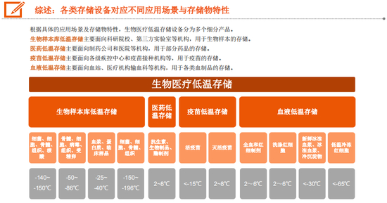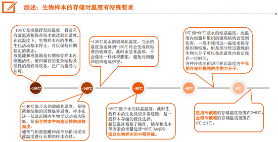 生物医疗低温存储设备是由制冷家电延伸出的细分领域,但由于保存物的特殊性,其对制冷的要求更高,也更多样。不同保存物对温度的要求差异很大,甚至包括-150℃以下的极低温度。为保留保存物的活性,温度恒定非常重要,对设备内的温度波动容忍度远低于一般低温设备。为保证存放在不同位置的保存物活性一致,设备内不同位置的温度也需要保持均一。部分生物样本存储期限较长,因此对设备本身的使用寿命也有较高要求。