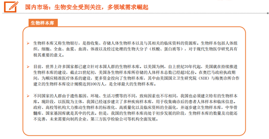 生物安全法推出在即,有望推动国内行业加速发展。