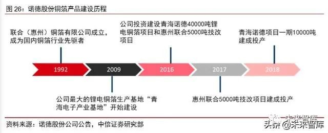 建设投资 1.5 亿元,铜箔产品总产能预计达到 73000 吨。2016 年,诺德股份获得国 开行专项基金首期1.4亿元投资,用于子公司青海诺德新材料40000吨锂电铜箔项目建设, 同时对子公司惠州联合铜箔电子增资 11363.7 万元,进行 2900 吨/年的产能扩建。至 2017 年 6 月,惠州联合改扩建项目完成,产能增加至 5000 吨/年。至 2018 年 6 月,青海诺德 项目一期完工,新增产能 10000 吨/年。未来仍有 30000 吨/年产能待建设,全部投产后公 司总产能可达 73000 吨。