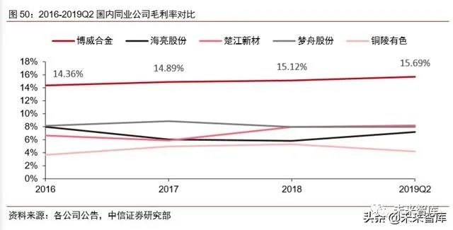 扩张产品定位高端市场,加速实现公司产品结构的高档化转变。随着我国集成电路、电子信息、通讯、新能源汽车、智能装备等相关新兴行业发展迅速,高端铜合金材料产生 了较大的新增需求,这客观上也促使铜合金材料加工行业不断向高精尖方向发展。2016 年至 2019 年 H1,公司高端板带销售占比持续增加,19 年 H1 销售占比达 40.82%,高端 板带毛利率也呈上升趋势。公司以 19 年募投项目为契机,继续大力推动铜合金材料的迭 代升级和持续高端化,新增募投项目产品毛利率较现有业务均有较大幅度提升,可以为集 成电路、5G 通信、新能源电池、航空航天等技术密集的下游行业提供更多的产品发展空间与行业发展可能,与下游行业的发展形成良好的互动推进,巩固、扩大公司在行业内的 优势地位,优化公司产品结构,提升公司盈利能力,构筑公司的新竞争力。