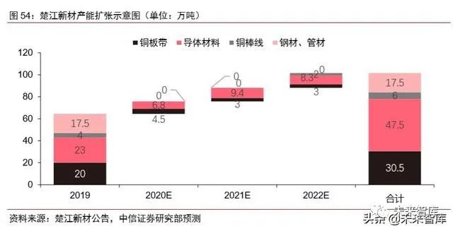 产能扩张项目陆续落地,进一步巩固行业龙头地位。2020 年 1 月 20 日,公司 18.3 亿元可转债募投项目预案通过证监会审核,募资计划用于铜材料产能扩张。项目包括 8 万 吨高精铜板带产能,26 万吨高品质铜杆产能,4 万吨高端细线产能以及 2 万吨高精密铜合 金线产能,合计扩充产能 40 万吨。此外,公司 2017 年通过定向增发募投的 7.5 万吨高精 铜板带产能于 2019 年年底开始投放,12 万吨铜导体材料产能预计将于 2020-2021 年间陆 续投放;随着可转债项目 2022 年底陆续落地,预期未来公司产能会有大幅增长,进一步 巩固行业龙头地位。在扩产项目陆续放量后,所有铜合金的总产能可由 2019 年的 64.5 万 吨上升至 2022 年的 101.5 万吨,增长率达 57.4%。