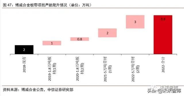 公司板材产能持续增加,高端产品产能占比增大。根据公司公告,2022 年公司板材 产能有望突破 8.8 万吨。公司 5 万吨特殊合金带材项目正处建设阶段,项目完成后公司的 高端带材产能预计进一步增加。2018 年中期投产的 1.8 万吨高端板带材已经在 2019 年放 量,我们该项目预计有望在 2020 年完全达产,用于满足 5G 通讯设备、电子和半导体、 新能源汽车等行业的新材料需求。