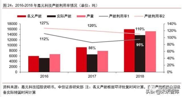 嘉元科技当前产能利用率维持较高水平,存在产能瓶颈。2016-2018 年,嘉元科技铜 箔产量分别为 6696.3、7913.5、15215.6 吨,按照 2016-2018 年公司名义产能为 6000、 9250、16000 吨计算,公司 2016-2018 年产能利用率为 112%、86%和 95%。若按照设 备实际转固时间计算,公司 2016-2018 年实际产能利用率为 127%、120%、110%,长期 处于较高水平。显示出当前公司有着明显的产能瓶颈,制约产销量的进一步增长。