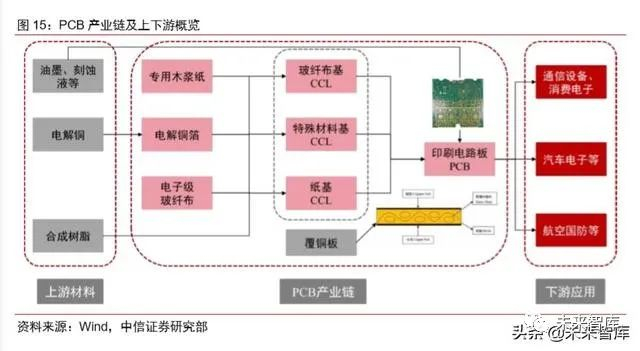 5G 基站将带动 PCB 产业链原材料需求快速上升。PCB,是每个电子产品承载的系统 合集,核心的基材是覆铜板,上游原材料主要包括铜箔、玻璃纤维及合成树脂。从成本来 看,覆铜板占整个 PCB 制造的 30%-40%左右,铜箔是制造覆铜板的最主要原材料,成本 占覆铜板的 30%(薄板)和 50%(厚板)。下游应用比较广泛,其中通信、汽车电子和消 费电子三大领域占比合计 60%,5G 基站的建设加速将拉动 PCB 产业链的快速发展。