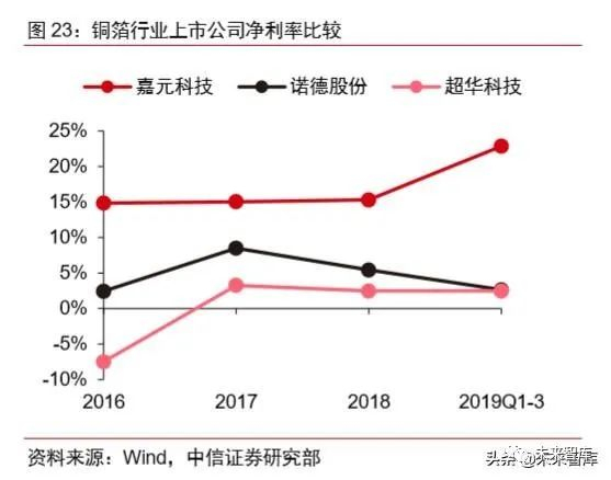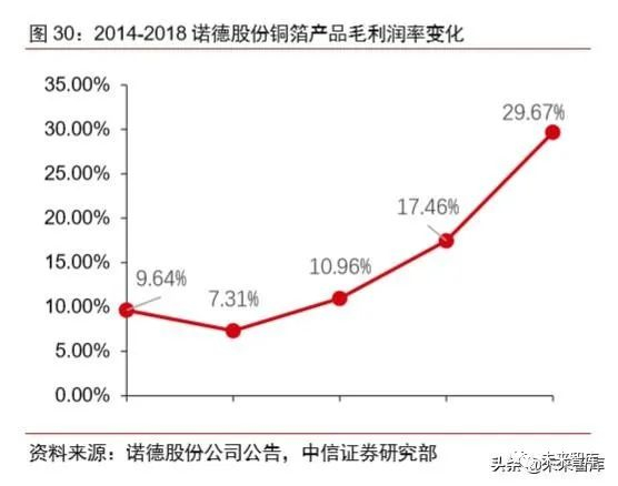 高端铜箔增产带动利润率提升。公司 2016 年起调整铜箔产品结构,增加锂电铜箔供 应,减少标准铜箔产量。2018 年公司毛利润率为 26.44%,净利润率为 5.42%。铜箔产品 方面,公司 2018 年铜箔产品毛利率达 29.67%,连续四年快速增长。随着未来 6μ锂电铜 箔产量占比增加和 4μm 超薄铜箔的批量生产,公司的利润率有望继续增长。