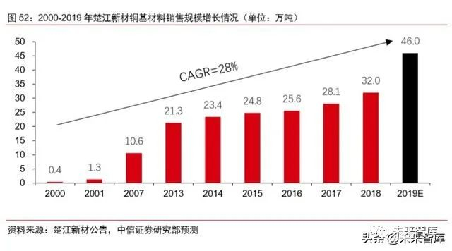 公司深耕铜合金加工领域多年,多项细分领域处国内领先地位。2000-2019 年,公司 铜基材料销售规模保持高增长态势,复合年增长率达 28%,2019 年铜基材料销量规模预 计达 46.0 万吨,创历史新高。铜板带方面:公司 2019 年铜板带产量 19.5 万吨,稳居国 内第一,并向全球第一迈进。根据中国有色金属加工工业协会综合排名,公司位于中国铜 板带材“十强企业”第一名;铜线材方面:2019 年公司铜线材产能达 4 万吨,规模位居国内 第一;铜导体方面:2019 年公司收购拥有 13 万吨铜导体产能的鑫海高导,加速铜导体材 料布局,优化公司自有生产线,并凭借鑫海高导原有渠道,有望进一步提升铜杆材料市场 占有率。
