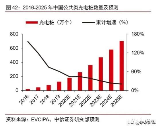 新能源汽车及充电桩发展空间巨大,增大铜板带需求量。作为国家重点支持的战略性新兴产业,新能源汽车及充电桩中长期成长趋势明确。根据中信证券研究部新能源汽车组 预测,2025 年新能源汽车产销量将达到 574 万辆,2019-2025 年 CAGR 为 29.6%。受益 于我国电动汽车充电桩规划、政府补助以及新能源汽车应用的快速增长,我国新能源汽车 充电设施行业面临巨大的发展空间,根据 EVCIPA 数据,我们预计 2025 年充电桩保有量 将达到 700 万个,2019-2025 年 CAGR 为 33.3%。我们预计未来五年,铜板带材的需求量 将会明显加速。
